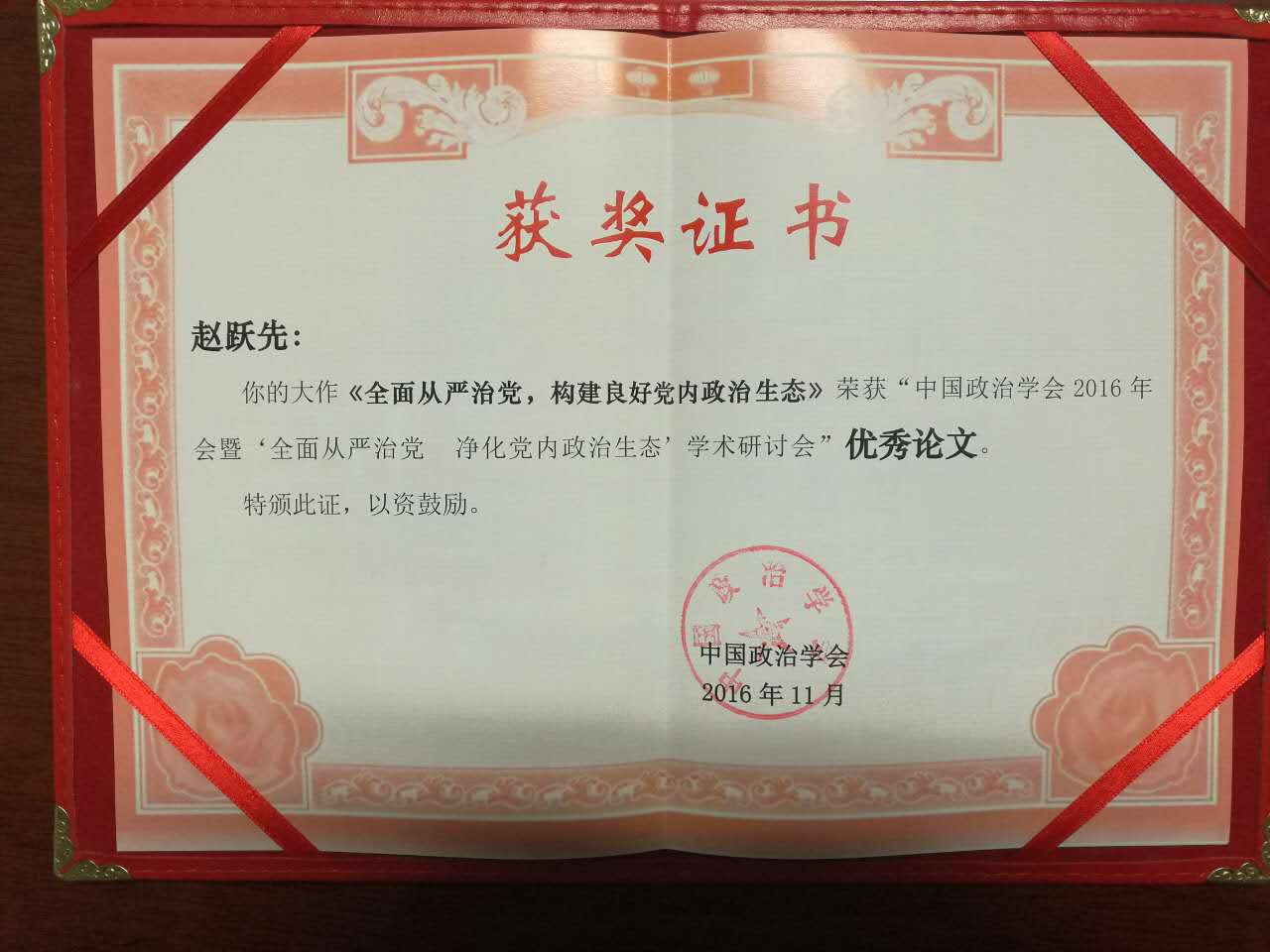 本次年会为期2天,政治学界知名专家高建、包心鉴、张献生、杨海蛟、王浦劬、桑玉成、张桂琳、周光辉、房宁、周平,以及来自中国社科院、北京大学、复旦大学、浙江大学等中国政治学研究领域的专家学者近400余人出席会议。公司教师赵跃先、胡志远和政法学院赵笑蕾老师参加了本次年会。本次会议共收到论文143篇,最终评出“优秀论文”11篇,公司教师赵跃先教授撰写的论文《全面从严治党,构建良好党内政治生态》获“优秀论文”奖。