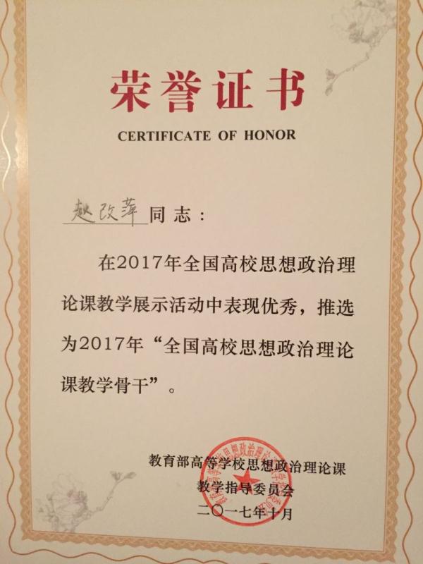 2017年10月27日至29日,由教育部高等学校思想政治理论课教学指导委员会主办的全国高校研究生“中国特色社会主义理论与实践研究”课现场教学展示活动在山东大学举行。公司教师赵改萍代表山西省参加了现场教学展示,并荣获“全国高校思想政治理论课教学骨干”的荣誉称号。
