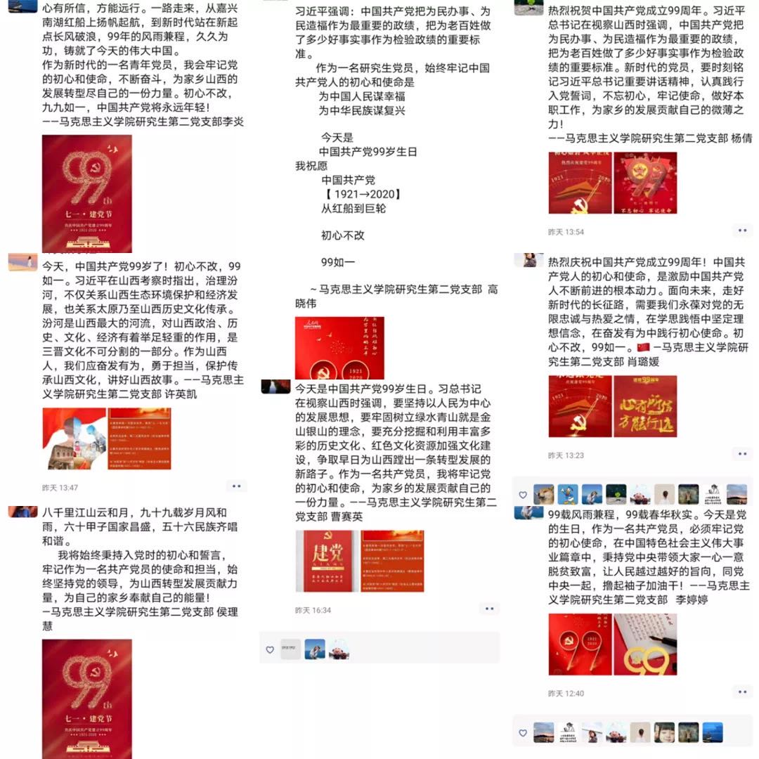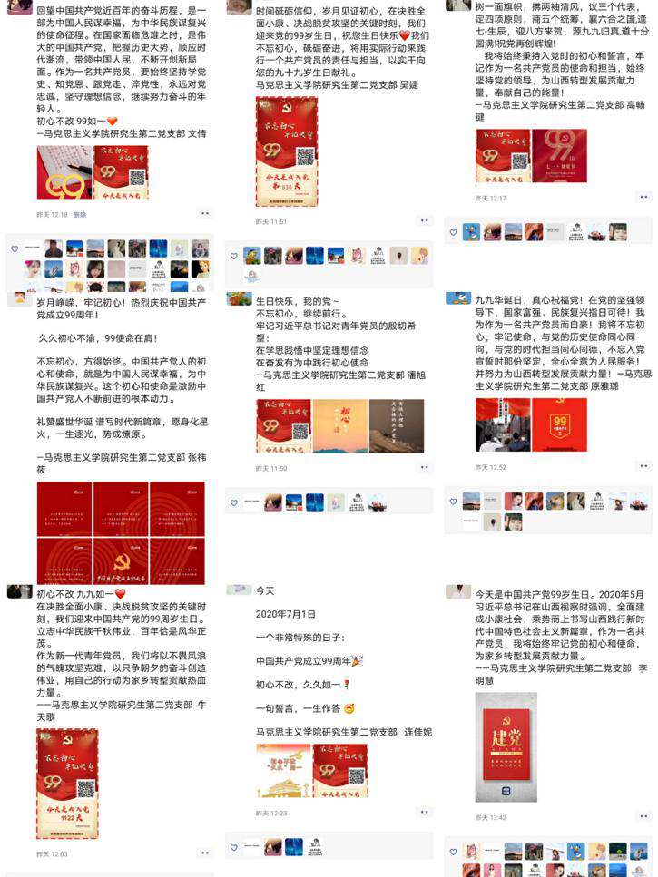 一、认真开展线上政治理论学习。研究生第二党支部借助微信工作平台在建党99周年当日推出习近平在“不忘初心、牢记使命”主题教育总结大会上的讲话金句、一张图读懂中共山西省委第十一届十次全会的学习材料,突出重点,提升学习实效。支部动员党员认真学习,掀起学习热潮。