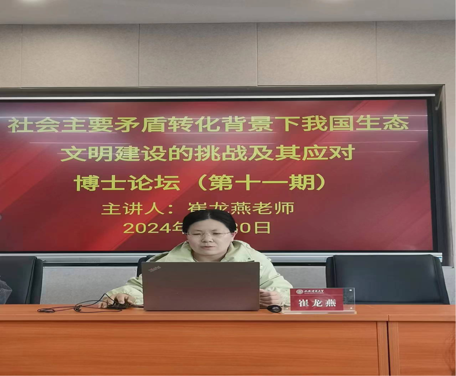 其次,崔龙燕老师作了题为《社会主要矛盾转化背景下我国生态文明建设的挑战及其应对》的报告。她从我国社会主要矛盾变化的视角出发进行生态建设问题的研究,指出社会中每一个领域都存在矛盾,生态文明建设领域的矛盾表现在两个方面:人民日益增长的优美生态环境需要问题和生态文明建设的不平衡不充分问题,又从供给侧和需求侧这两个角度对这一矛盾进行分析,并结合具体事例和数据展开论述。