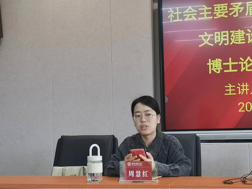 接着,她以矛盾的主要方面为切入点,对于生态文明建设不平衡不充分问题从构成维度、动力维度、空间维度等方面展开论述,指出生态文明建设主要解决的是进入工业文明以来,工业所导致的资源枯竭、污染集聚和生态破坏问题。因此,国家将生态文明建设的重点紧紧放在这三个方面,采取了开发新能源、蓝天碧水净土保卫战、提高森林覆盖率等有效措施,并结合塞罕坝机械林场、秦岭别墅事件等典型案例进行深刻分析。此外她还强调生态文明建设需要借助各个主体、各个部门和各项技术的力量,以此来促进生态的恢复。