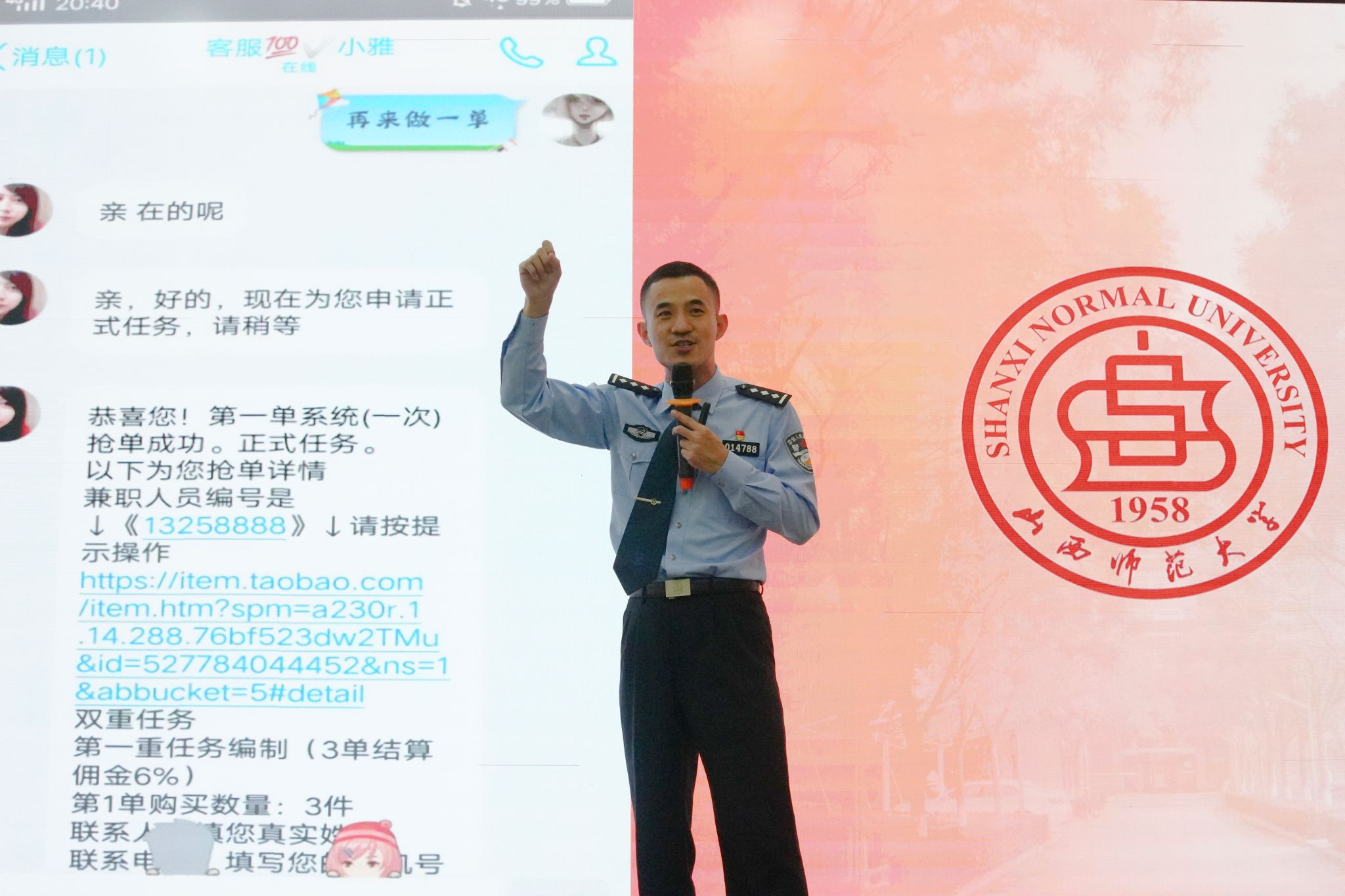 为切实增强师生对电信网络诈骗的防范意识,5月23日,公司与初心社区在北区2号教学楼毓秀学堂共同举办了“平安守护,警校同行”防范电信诈骗专题讲座。本次讲座特邀太原市公安局直属分局的王警官担任主讲,2024级员工代表参加。