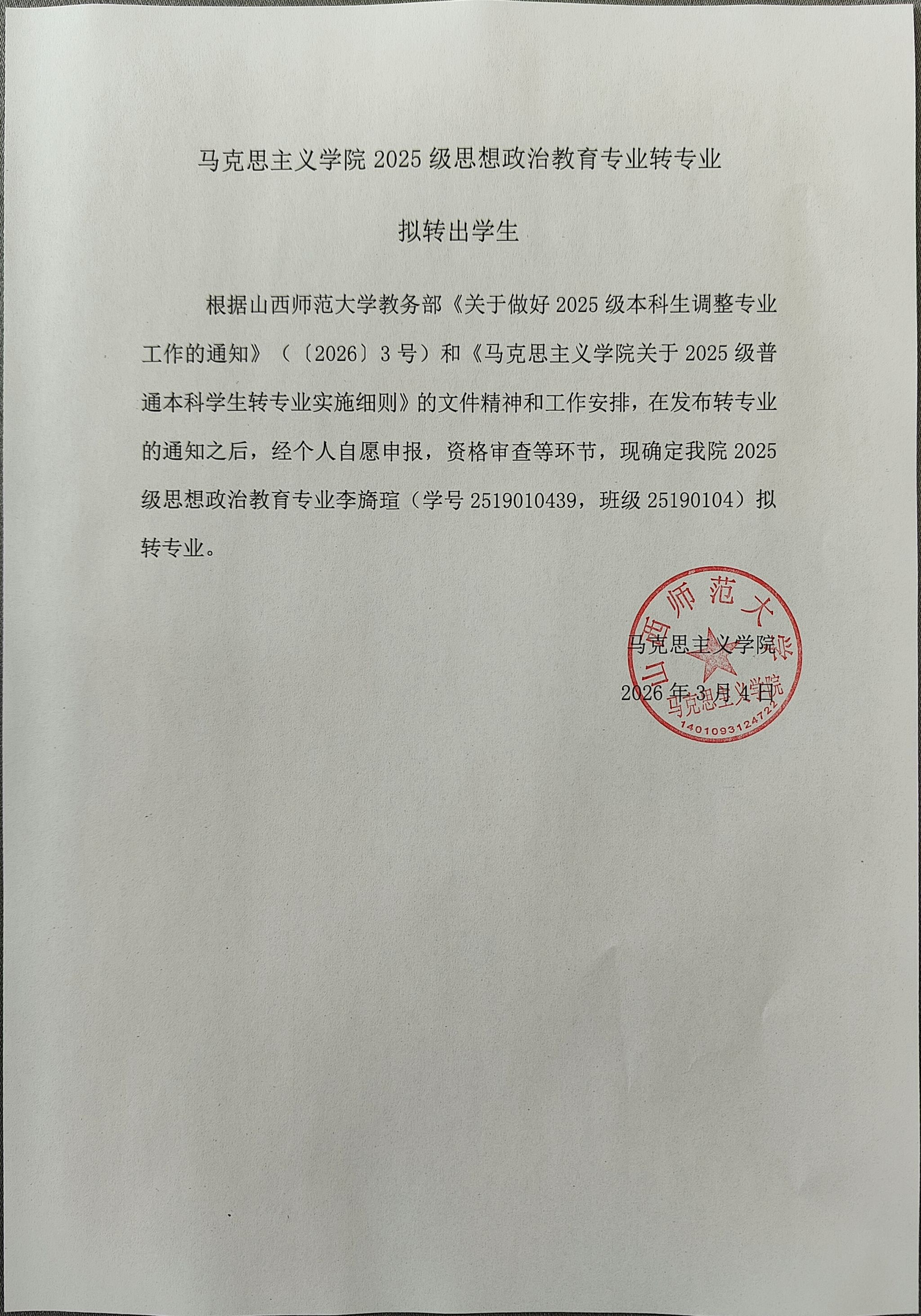 2026年春季拟转入304永利集团思想政治教育专业名单公示