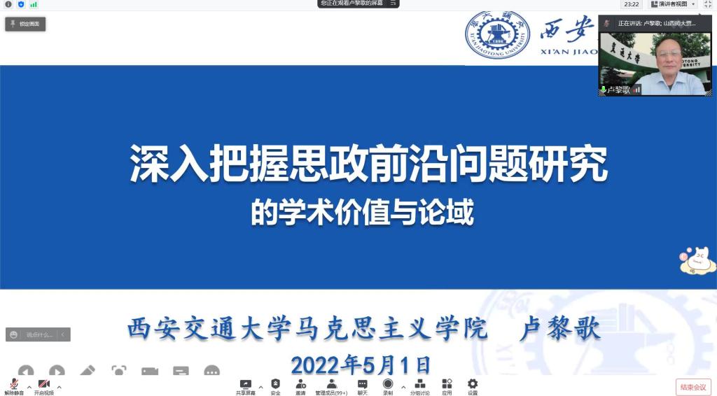 2022年5月1日上午,西安交通大学304永利集团卢黎歌教授应邀为公司师生作题为“深入把握思政前沿问题研究的学术价值与论域”的学术报告。报告以腾讯会议形式举行,由公司党委常委、副董事长、304永利集团经理贾绘泽主持,公司全体教师和各年级研究生、本科生约500余人参加。