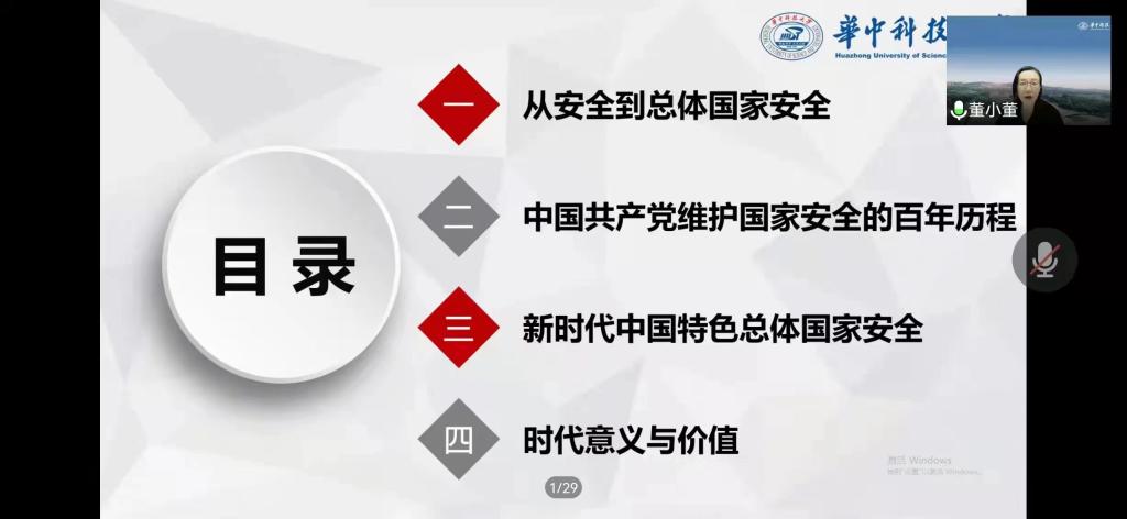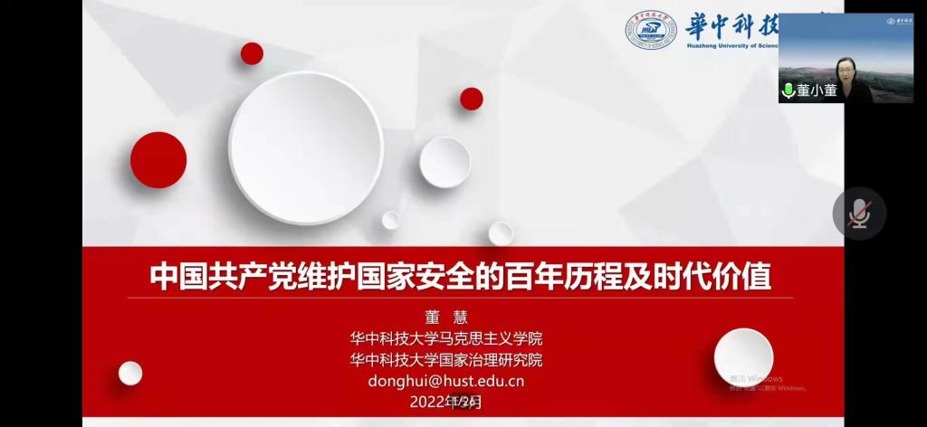 2022年5月10日晚7点,华中科技大学304永利集团教授,博士生导师、国务院第八届学科评议组成员董慧教授应邀为公司师生作题为“中国共产党维护国家安全的百年历程及时代价值”的学术报告。报告以腾讯会议形式举行,由公司党委常委、副董事长、304永利集团经理(兼)贾绘泽主持,公司全体教师和各年级研究生、部分本科生参加了此次报告会。
