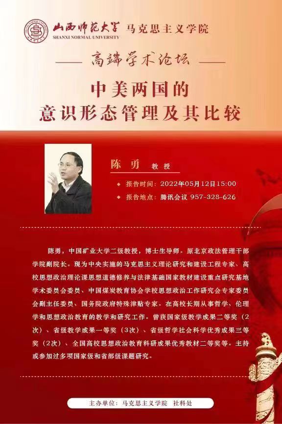 2022年5月12日下午3点,中国矿业大学(北京)二级教授、博士生导师、马克思主义理论研究和建设工程专家、国务院政府特殊津贴专家陈勇教授应邀为公司师生作题为“中美两国的意识形态管理及其比较”的学术报告。报告以腾讯会议形式举行,由公司党委常委、副董事长、304永利集团经理(兼)贾绘泽主持,公司全体教师和各年级研究生、部分本科生参加了此次报告会。