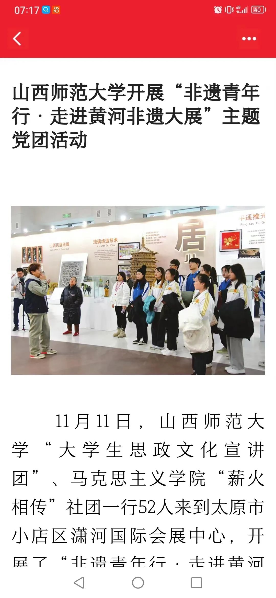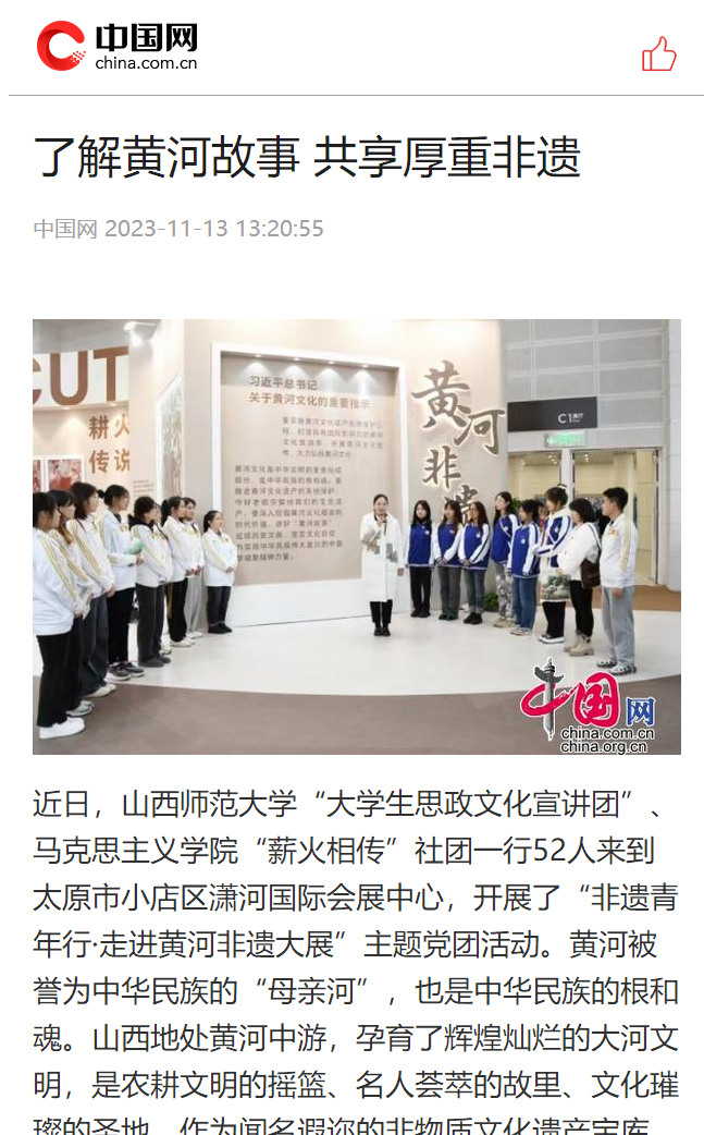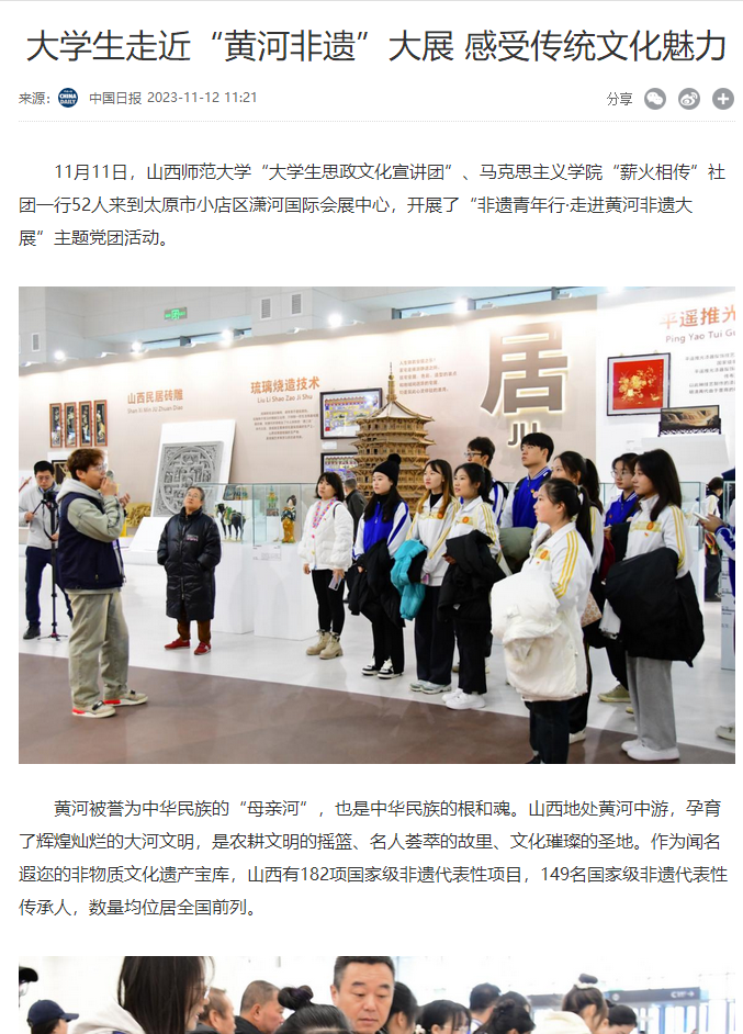 为贯彻落实习近平总书记考察山西重要指示精神,引导青年积极投身于文化传承与创新的实践中去,为非遗的保护与传承注入新活力,11月11日上午,公司团委联合304永利集团“薪火相传”党支部开展了“以文化人 凝心铸魂——非遗青年行·走进黄河非遗大展”主题党团活动,公司团委员工会各部门员工代表、本科生“薪火相传”党支部师生代表、青马骨干培训班员工代表以及老员工理论宣讲团员工代表共同参加。
