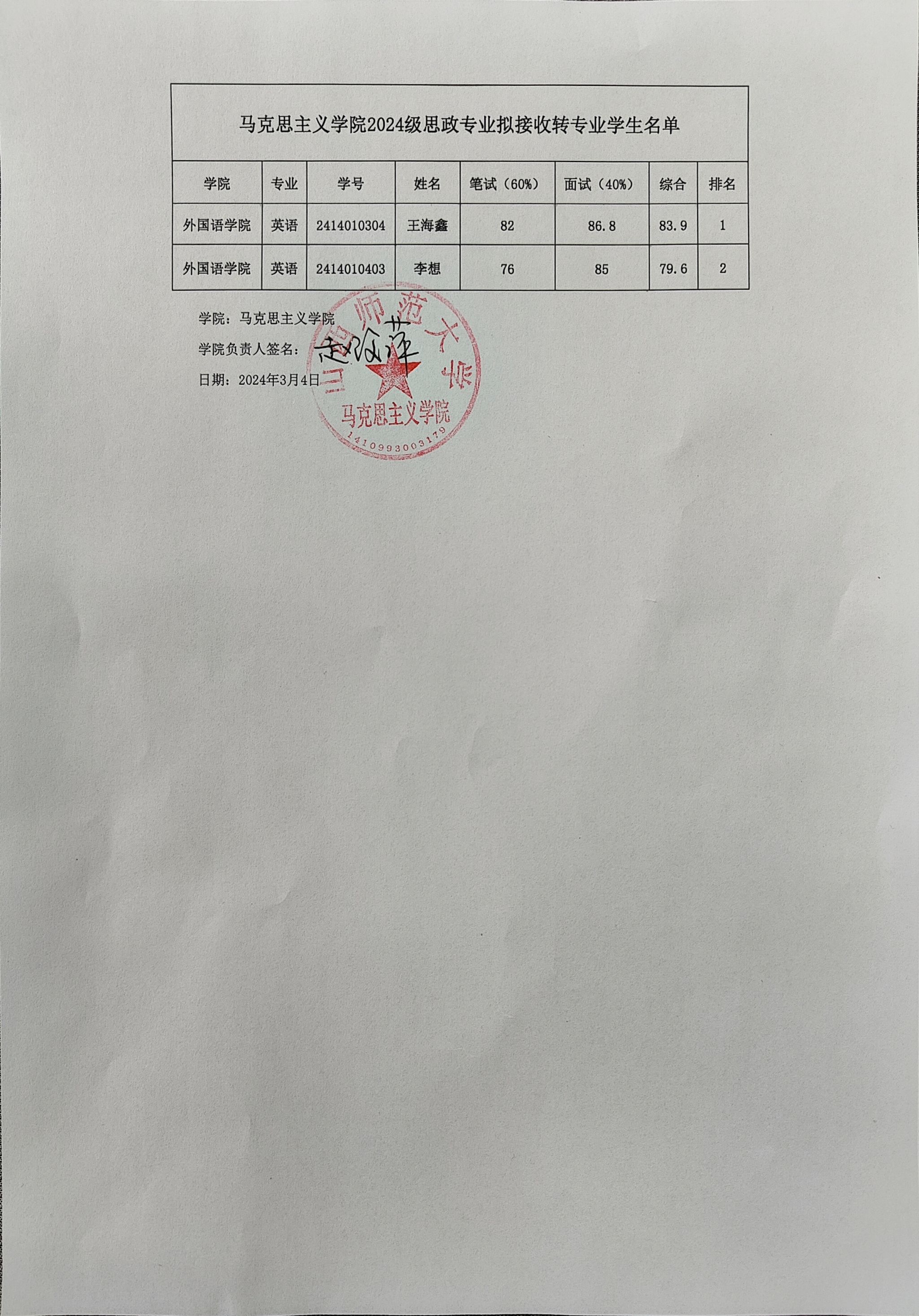 304永利集团2024级思政专业拟接收转专业员工名单